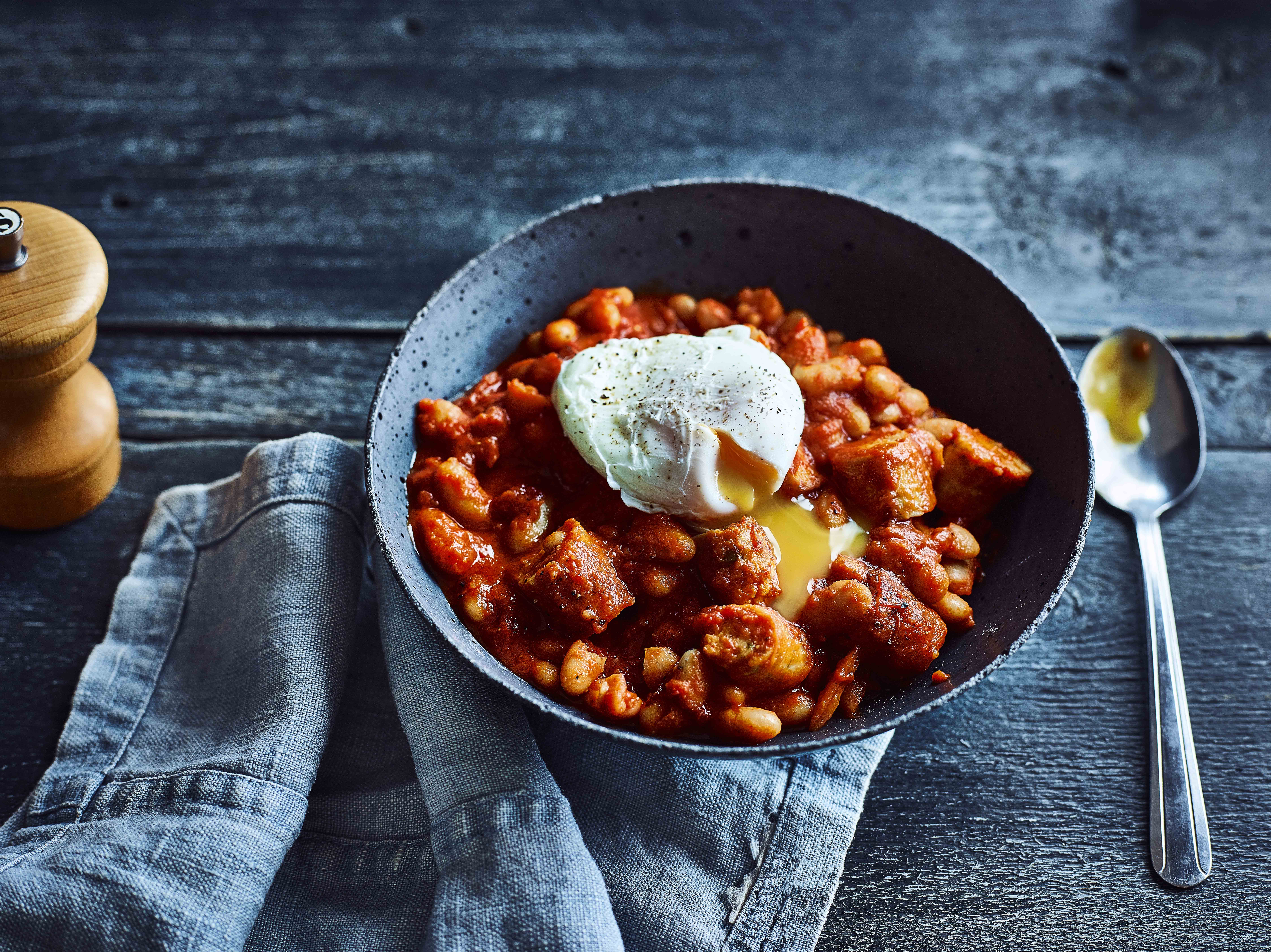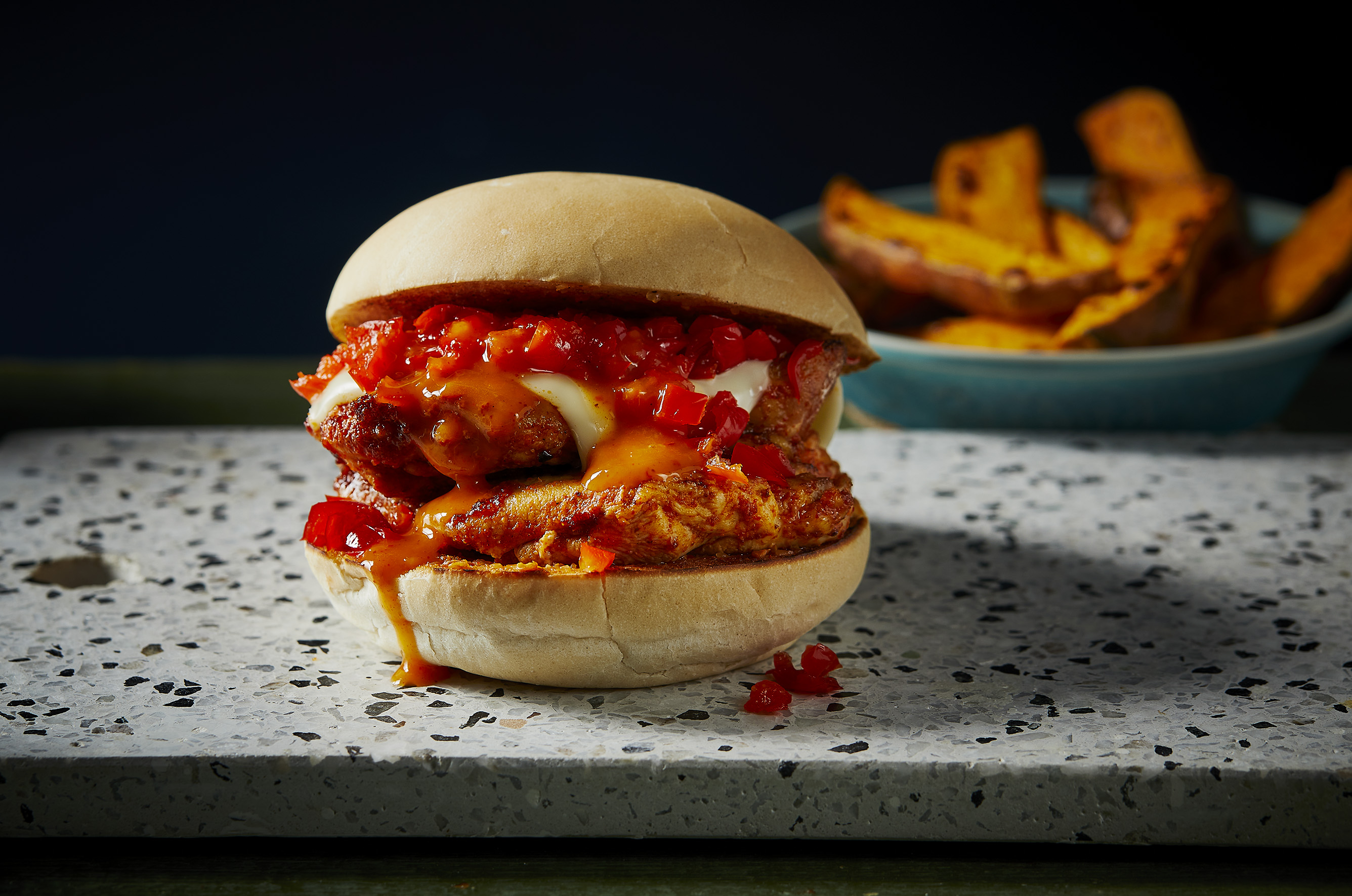 Golden, crispy chicken topped with a smoky, pepper relish with sweet potato wedges on the side.